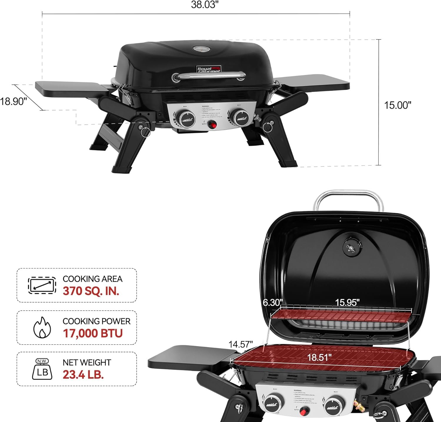 Ample Cooking Space: With a spacious 270 sq. in. main cooking area, this portable propane grill offers ample room for meats, vegetables, and more to perfection. Additionally, it includes an extra 100 sq. in. warming rack for keeping cooked food warm