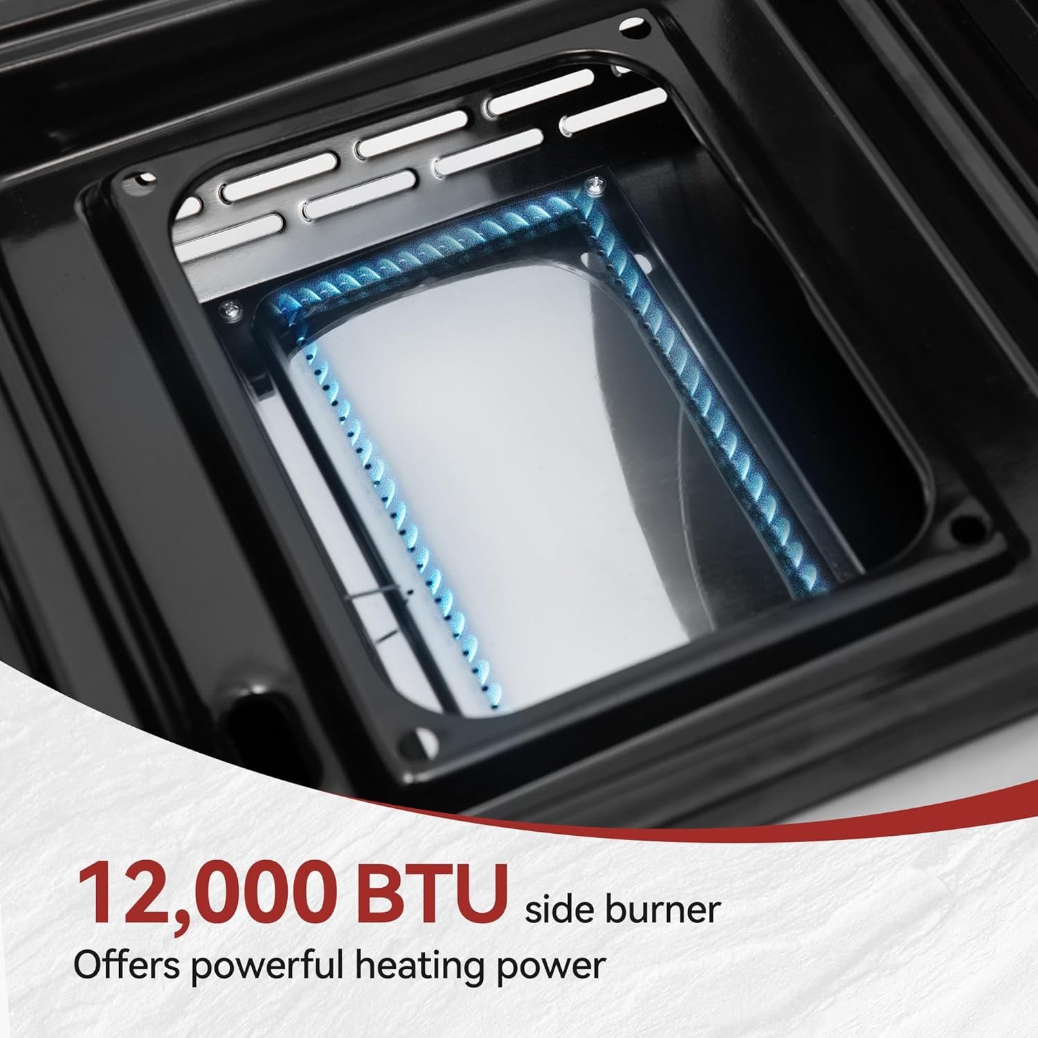 Powerful & Functional Design: Experience 29,000 BTU Power (2 x 8,500 BTU main burners + 12,000 BTU side burner). Features include a Side Burner Lid (cover/shelf, 10 lb. max load capacity), Griddle Lid (protection/wind guard), Easy Cleanup (removable grease cups), and Battery-free Operation (piezo ignition)