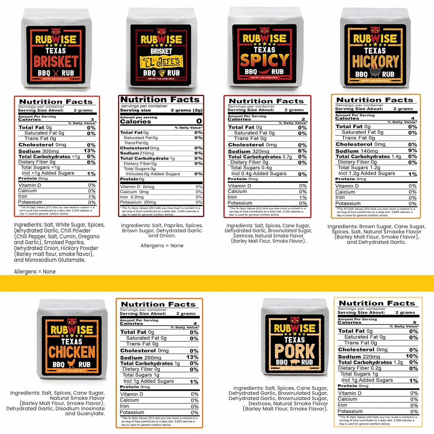 Six Variety Rubs: Receive one of each flavor of our signature 1lb bags of Rubwise Texas Style BBQ Rubs: Brisket, Pork, Chicken, Hickory, Spicy, and El Jefe’s Premium Blend, as well as a RubWise spice shaker