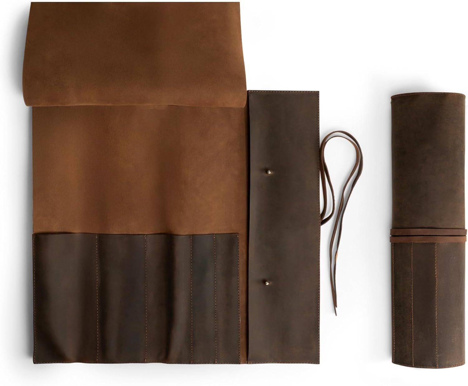 A Statement of Professionalism: Featuring Hide & Drink’s Rustic Knife Roll creates an immediate impression in any professional kitchen environment. Reflect your dedication through thoughtful, artisanal design that accompanies you from prep area to prep area. As your tools acquired character, so will your rustic roll, developing a unique patina that echoes a chef’s journey, rooting your work in tradition while embracing individuality.
