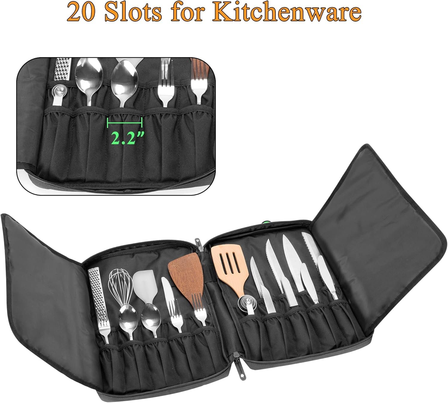Second Layer: Unfasten the secure fasteners and flip the loose-leaves to see more storage space of knife kit bag; with total 20 slots 2.2 inches wide for slicing knife, bread knife, carving knife, ladles, egg beater and other kitchenware up to 17.5 inches