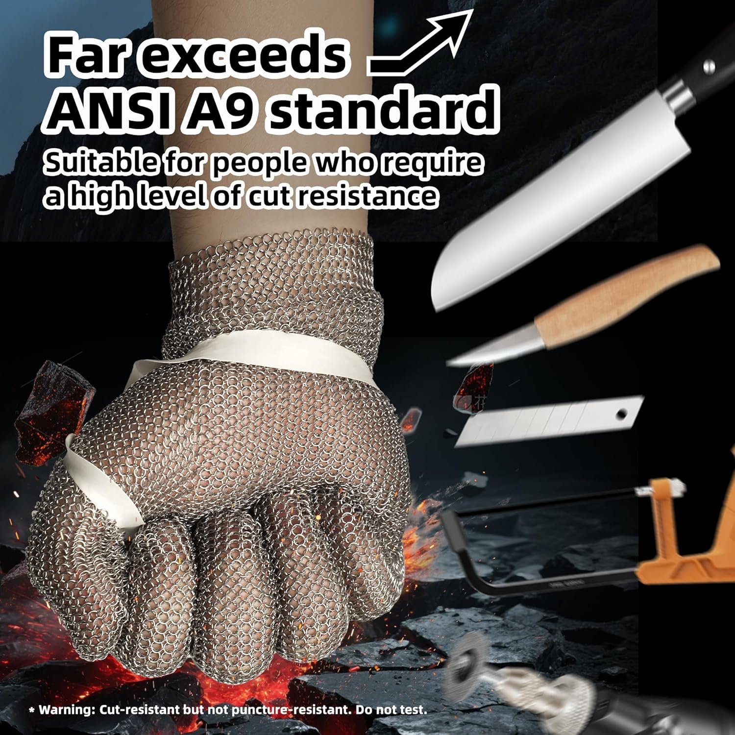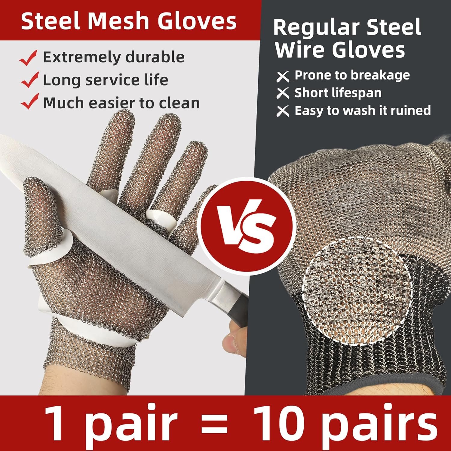 【Unique Chain Mesh Design】- This chainmail glove consists of metal rings locked together. The chain protects against cuts and incisions by blocking the tip of a sharp implement before it can get close enough to pierce the skin, making them the optimum hand-wear in blade handling settings.