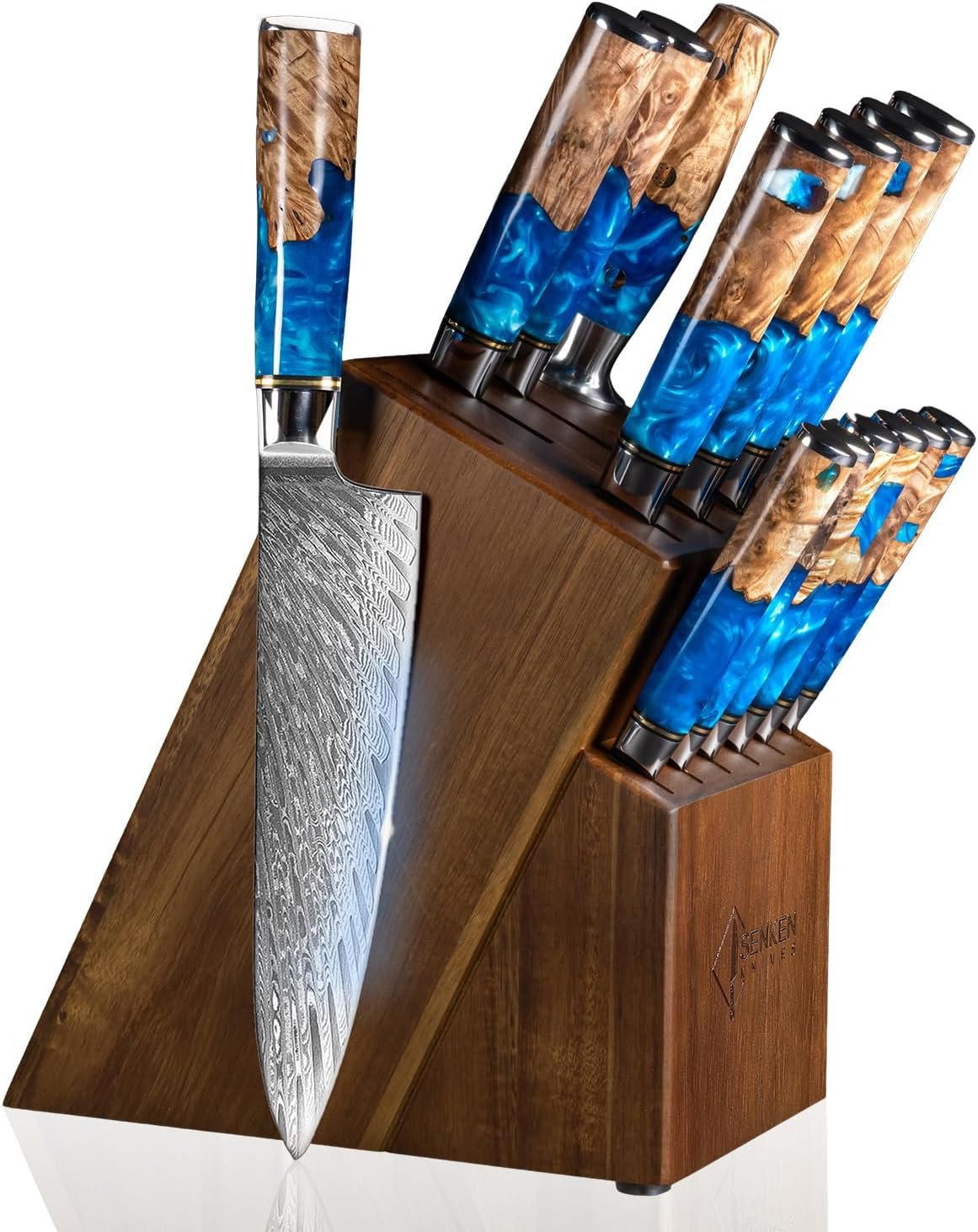 SENKEN 15-Piece Damascus Knife Block Set – “Tsunami” Collection Japanese Chef Knife Set – 67-Layer Japanese VG10 Steel Blades, Includes Chef Knife, Cleaver, Bread Knife, 6 Matching Steak Knives & More