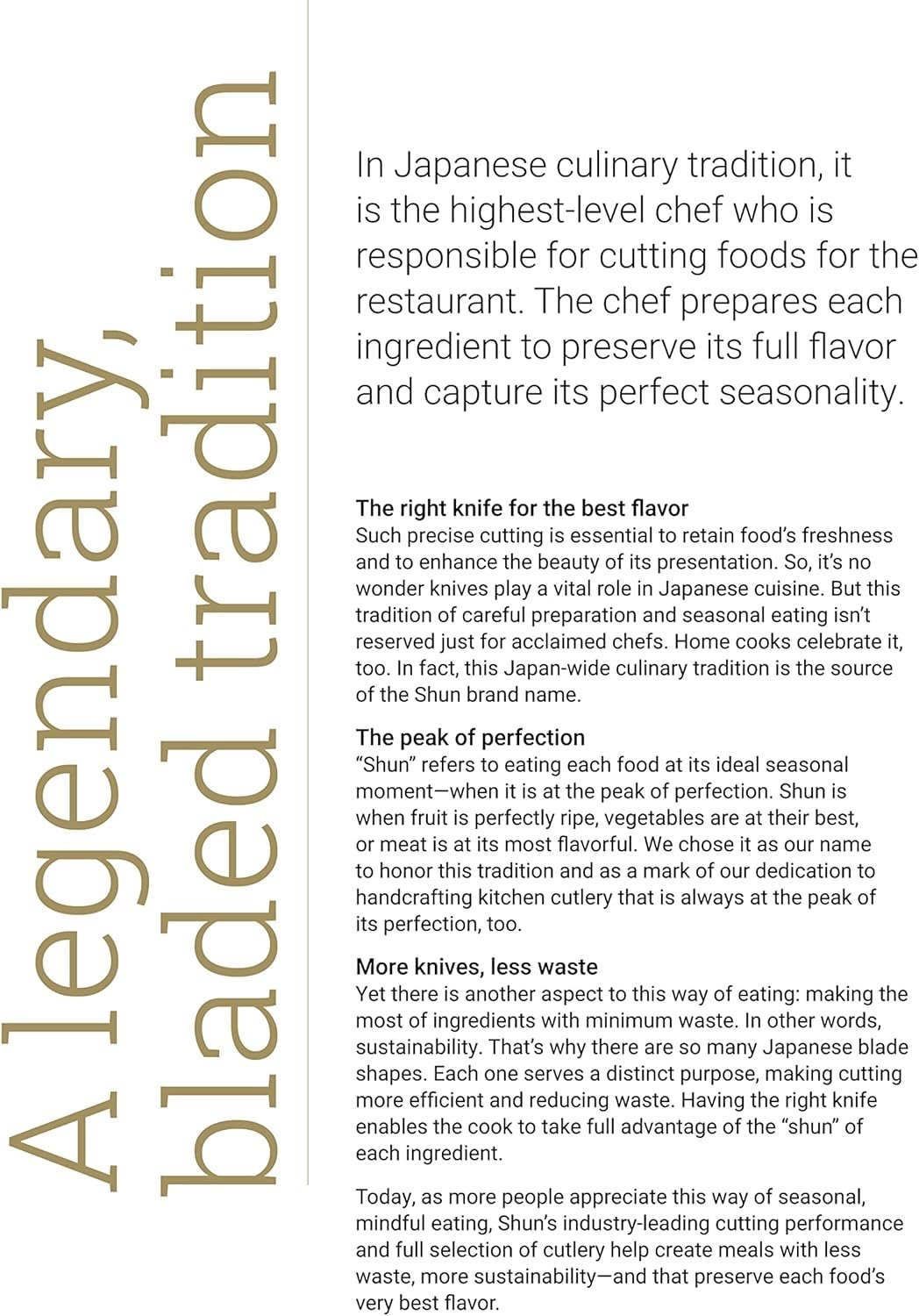 JAPANESE CRAFTSMANSHIP: Each Shun knife is meticulously handcrafted in Japan, reflecting a legacy of traditional knife-making expertise and a dedication to superior quality.