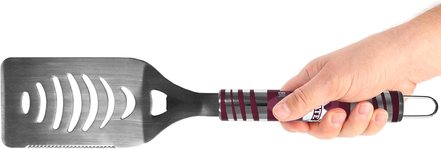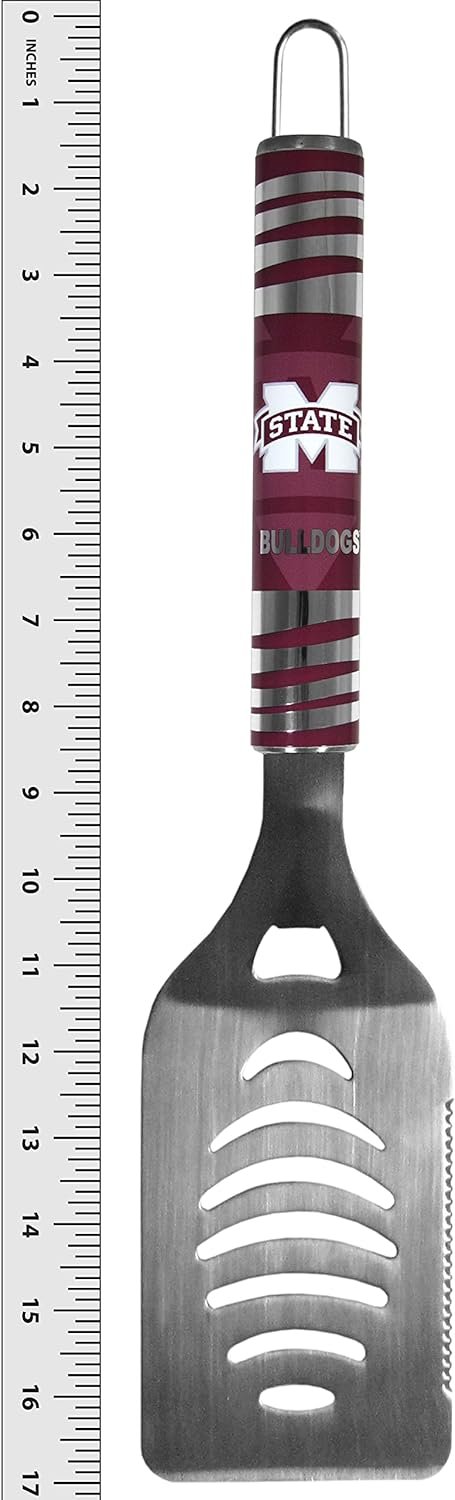 The eye-catching chrome graphics on this set make it a game day favorite! the high-quality, 420 grade stainless steel 3 pc Mississippi St. Bulldogs BBQ grill set will make any grill master smile. These barbeque tools are made to last whether you are using them for camping, tailgating or a patio party you will have quality grill tools for years to come. The set includes a large spatula with a bottle opener feature and sharp serrated edge, strong tongs and fork. The 16 inch length keeps you far from the flames. The quality of the tools make them a great choice for father’s day or Christmas gifts, they are really a grill accessory must have.