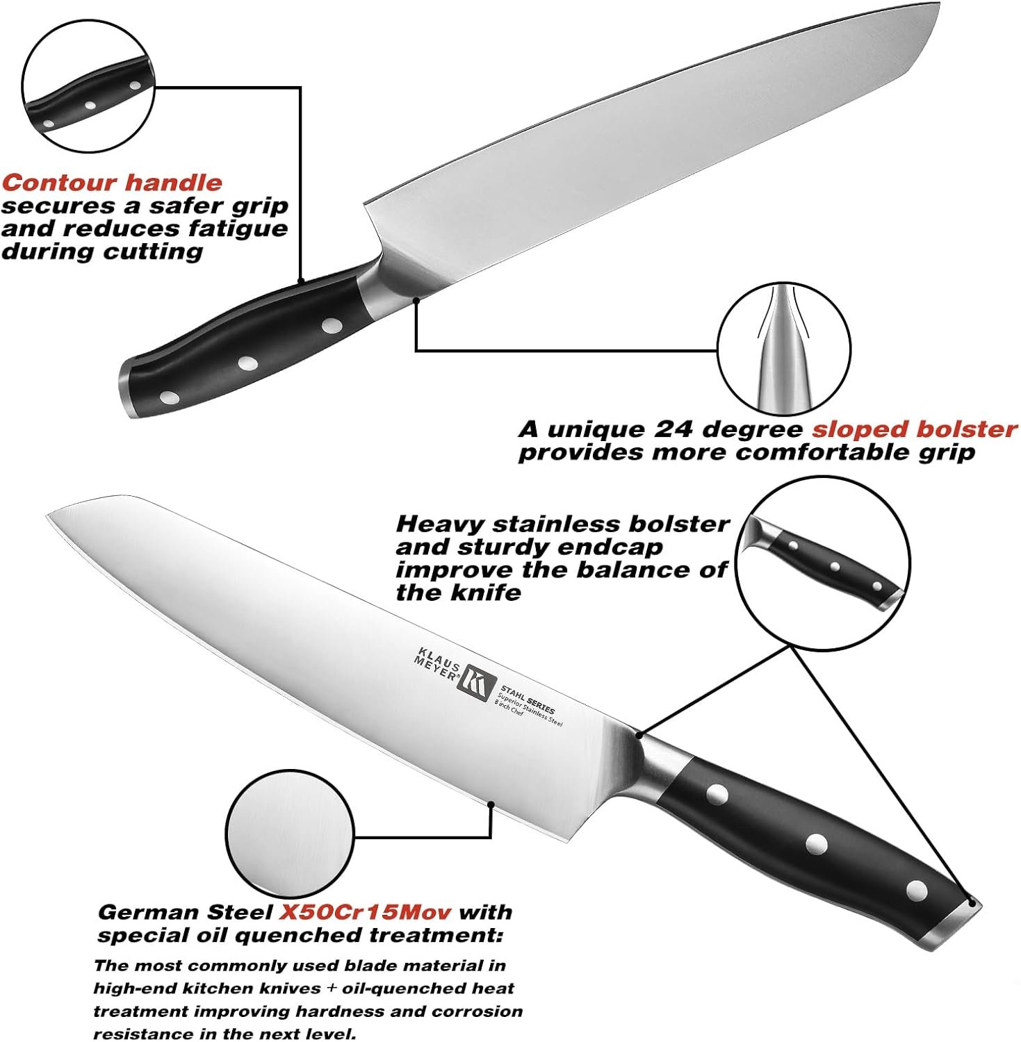 【Guaranteed Choice】WE PURSUE HIGHEST QUALITY, NOT PRICE! 10-year warranty keeps off any defect and imperfection of the knives, making it impeccable after delivery. Klaus Meyer Knife is your ideal choice in kitchen or gift for your loved ones.