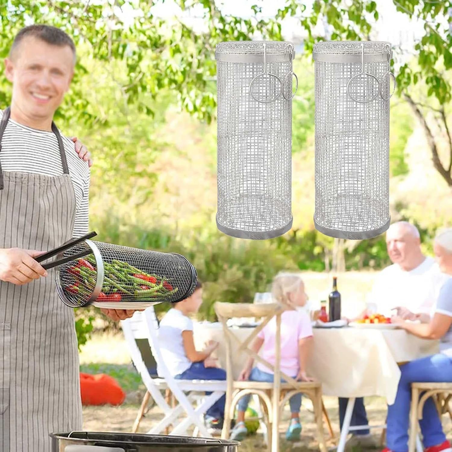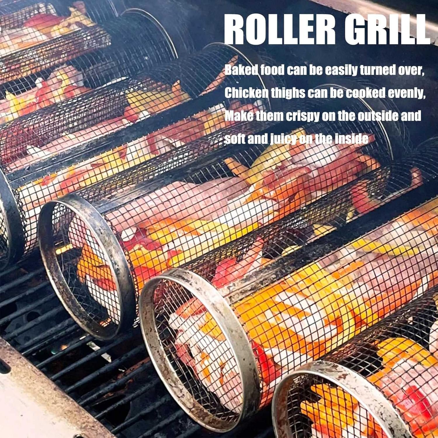 Stainless Steel Rolling Grill Basket – BBQ Mesh Cylinder for Vegetables, Shrimp, Fish – Premium Grilling Accessory for Outdoor Cooking & BBQ Parties