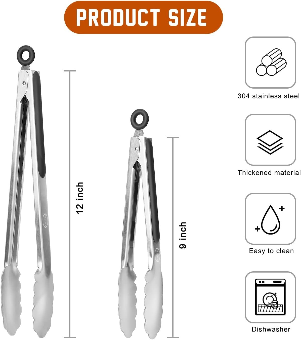 【PROFESSIONAL QUALITY STAINLESS STEEL】Made of thick, corrosion resistant stainless steel, carbon free, sturdy, heat resistance, anti-rust. Set of 2 essential kitchen tools, including 9” and 12” grill tongs, which can meet your various cooking needs.