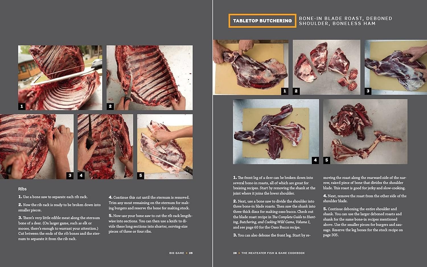 • Big Game: Techniques and strategies for butchering and cooking all big game, from whitetail deer to moose, wild hogs, and black bear, and recipes for everything from shanks to tongue.