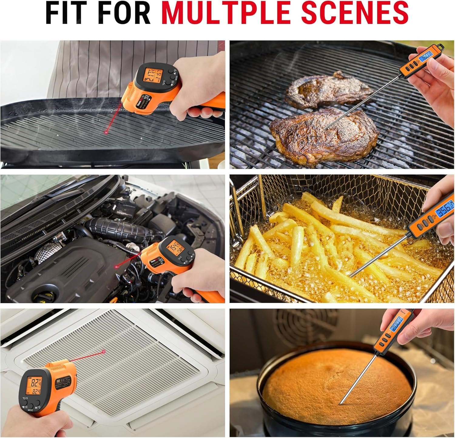 【More Valuable 2-in-1 Set】Include a temp gun and instant read thermometer; The laser thermometer with range from -58 to 1022 °F supports food prepare, auto maintenance, home repairs, while the cooking thermometer ranging from -58~572 °F gets internal temps for BBQ, grill, smoker, deep-frying and candy making