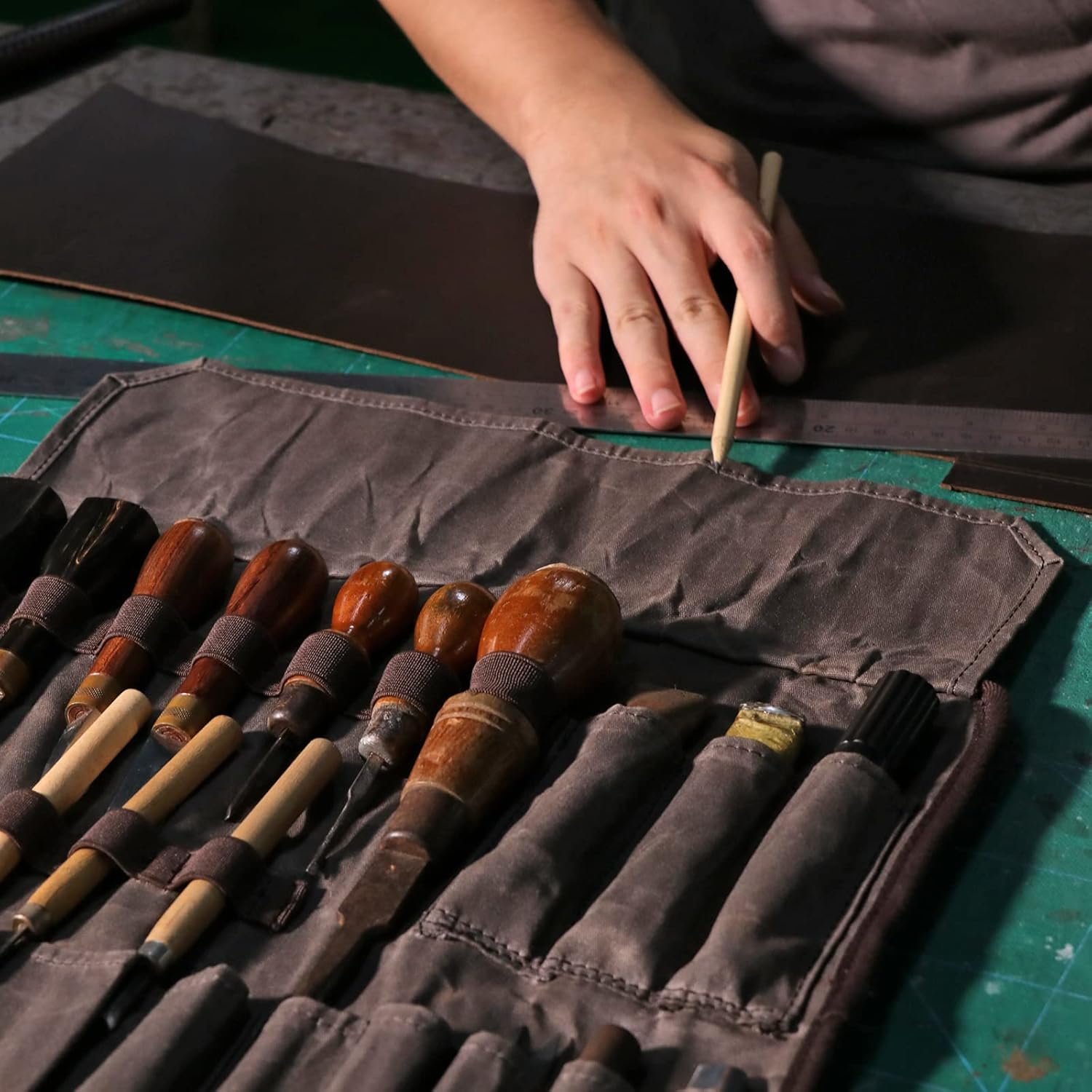 Roll-up Woodworking Tools Organizer: The roll-up design allows you to pack tools neatly and take them with you wherever you go. The leather straps and buckles ensure that everything stays securely in place, even during transport