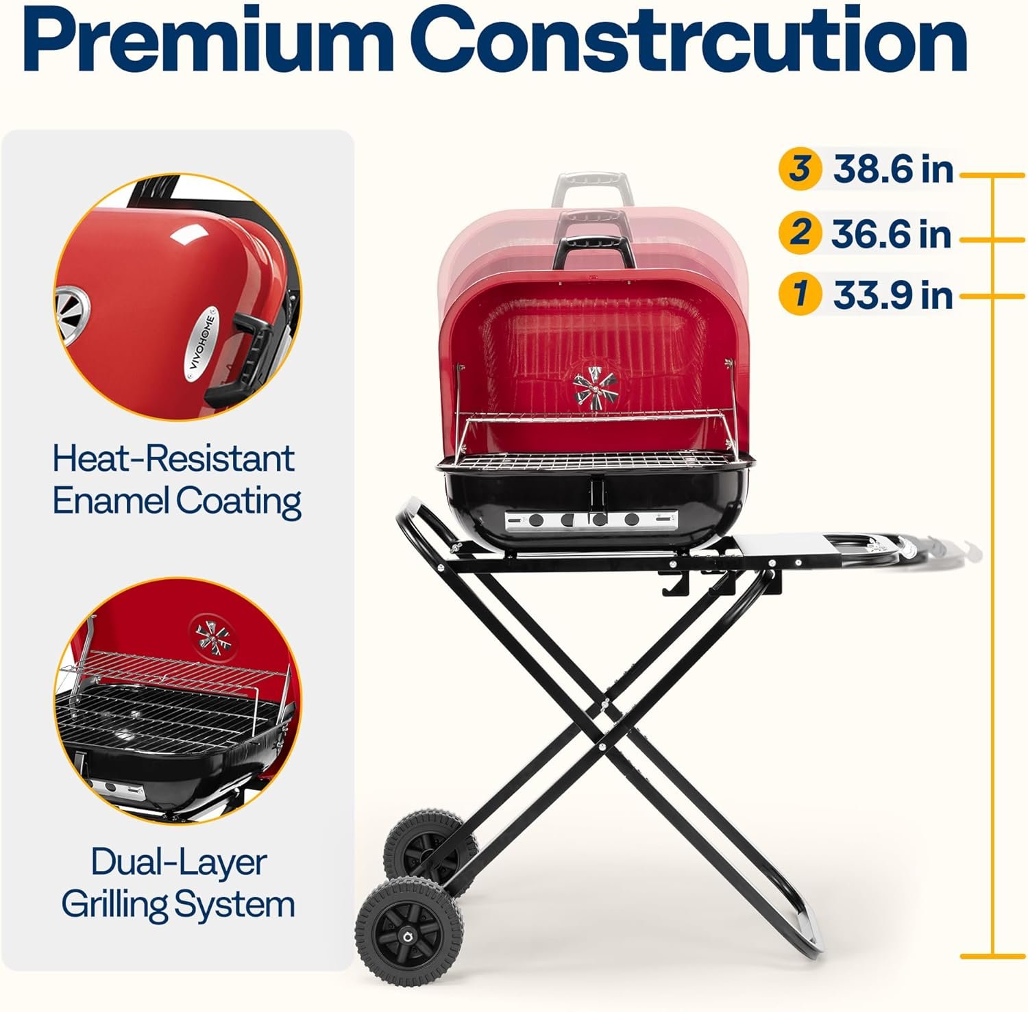 PREMIUM CONSTRUCTION: Made with high-quality steel for durability and sturdiness; Adjustable height with three settings (33.9, 36.6, and 38.6 in) to suit different user preferences; Features a heat-resistant enamel coating that protects against rust and wear; The enamel-coated lid provides a smooth, glossy surface that enhances durability and heat retention
