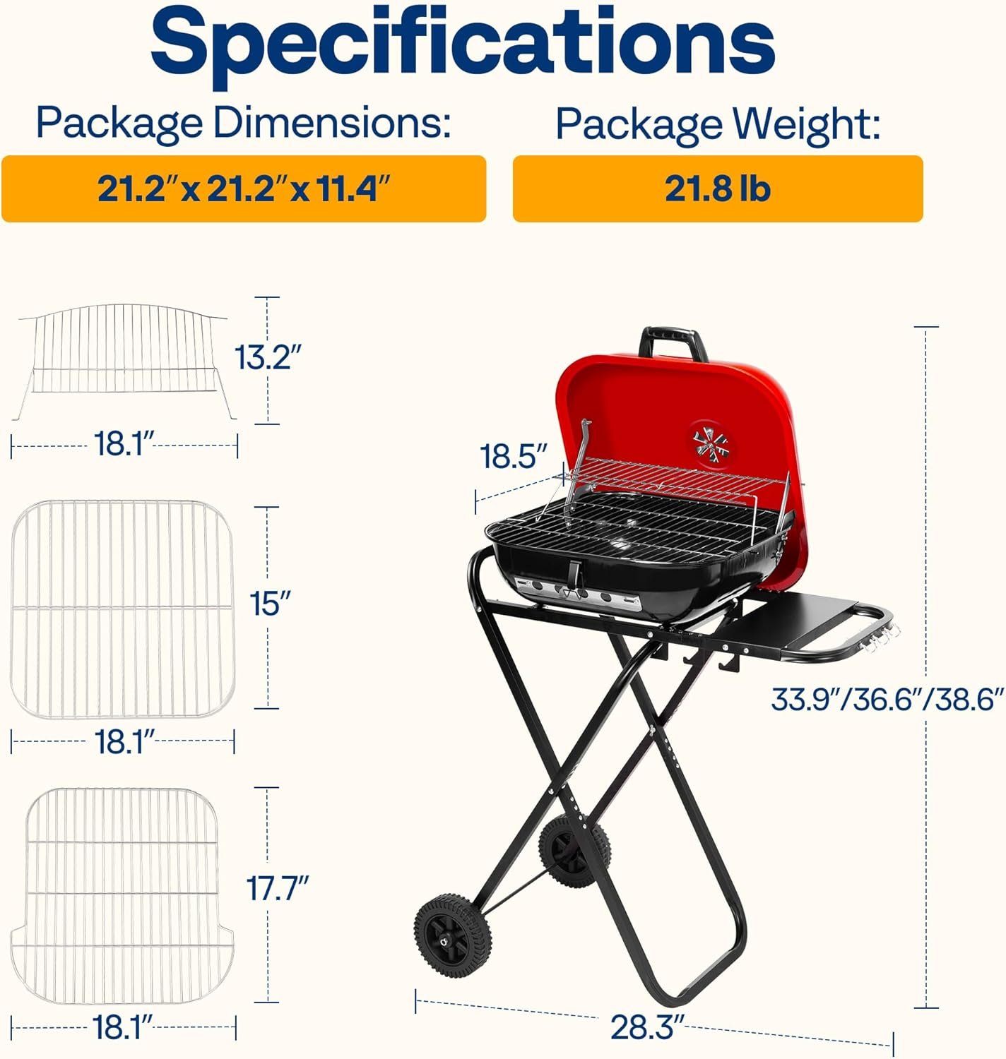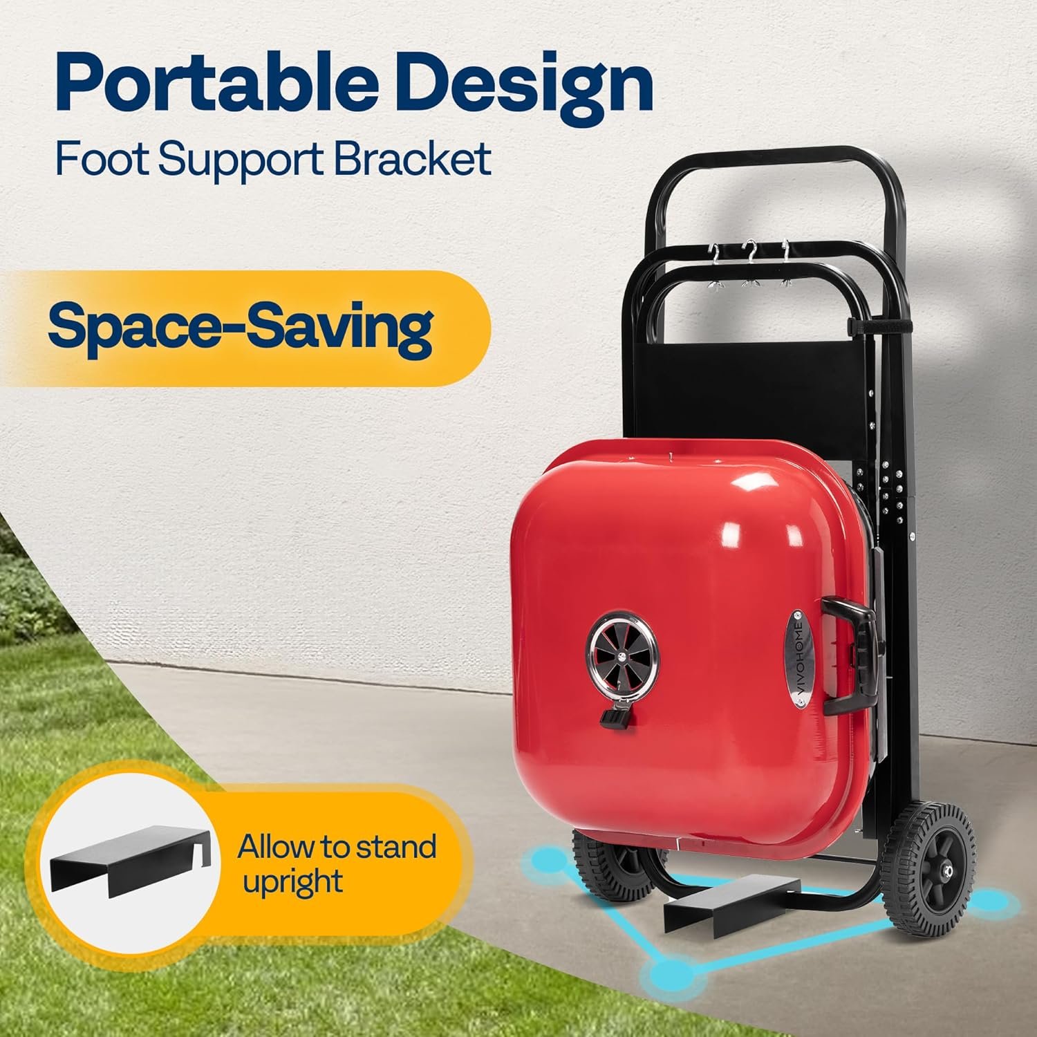 COMPACT AND PORTABLE DESIGN: The lightweight frame and folding legs make it easy to transport and store; It includes a sturdy foot support bracket that allows the grill to stand upright or lean against a wall when not in use; The rolling wheels make it ideal for tailgating, picnics, camping, and beach outings; The compact design allows for hassle-free setup and space-saving storage