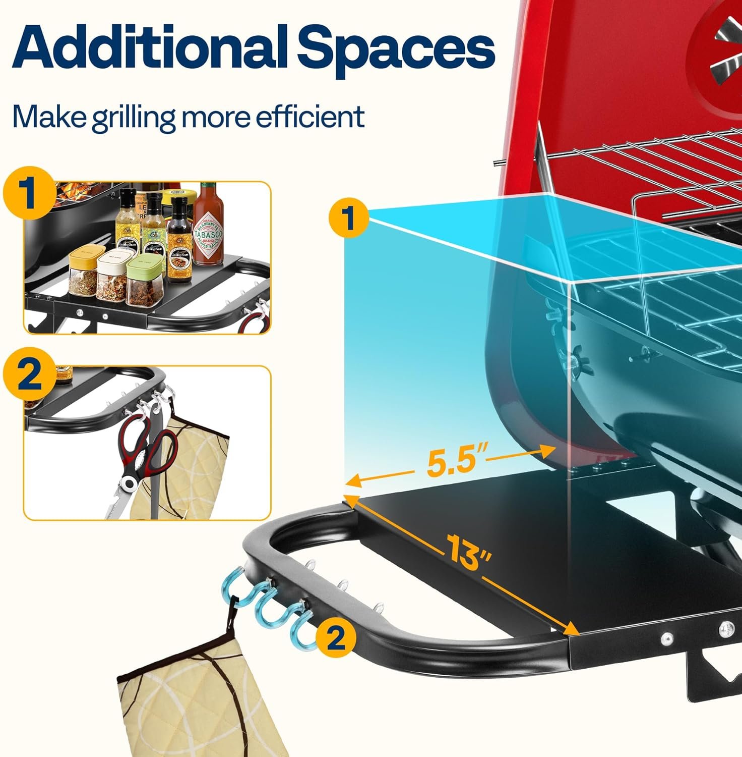 SPACIOUS COOKING SPACE: The spacious side panels provide extra workspace; The side panels featuring 4 convenient hooks for hanging barbecue tools keep grilling tools organized and easily accessible; The dual-layer grill design can be used for grilling and temporarily storing cooked food, providing great convenience