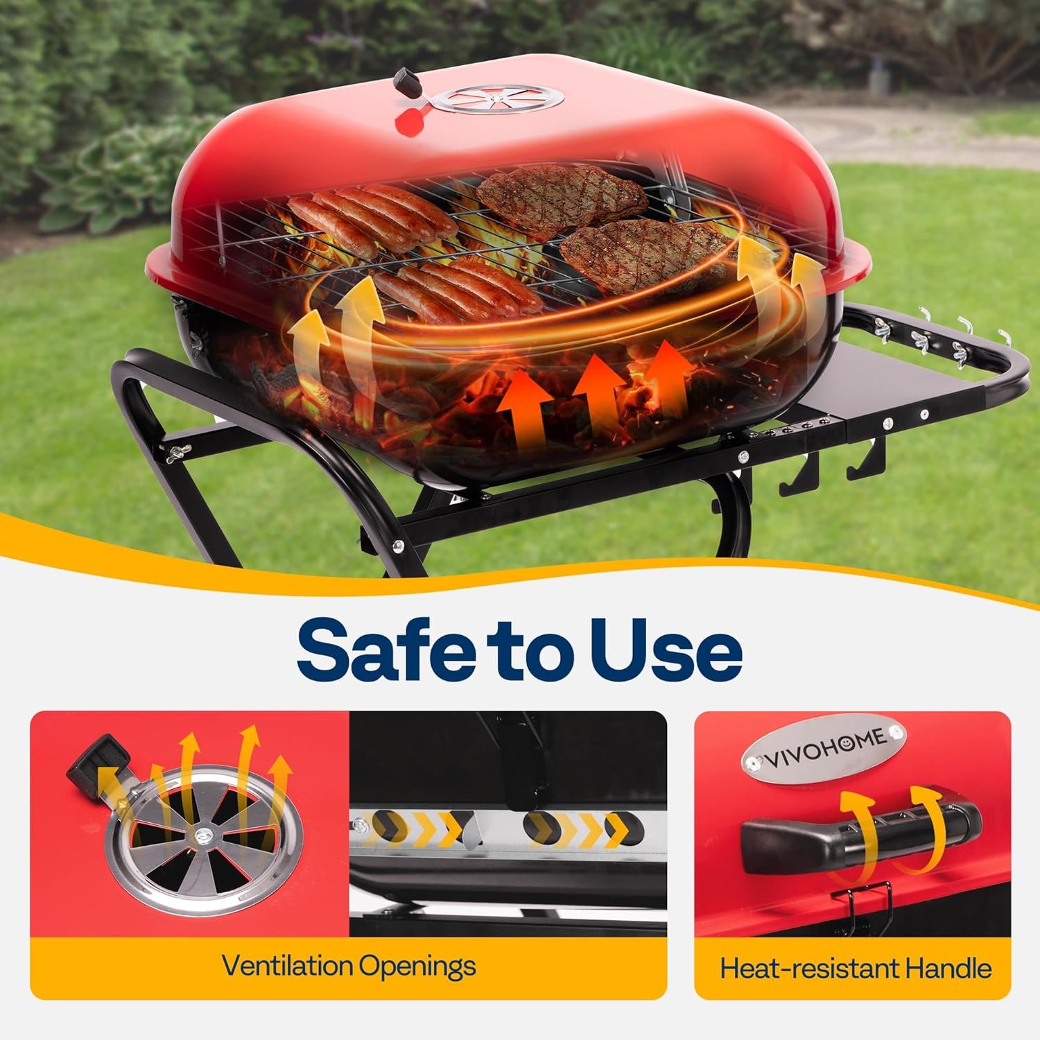 SAFETY AND CONSIDERATE FEATURES: Equipped with heat-resistant handles for safe operation; Two adjustable ventilation openings allow for precise control of airflow; The lock latches secure the lid during transportation, and when opened, reveal a dual-layer grilling system with a chrome-plated charcoal grate and a heavy-duty cooking grate