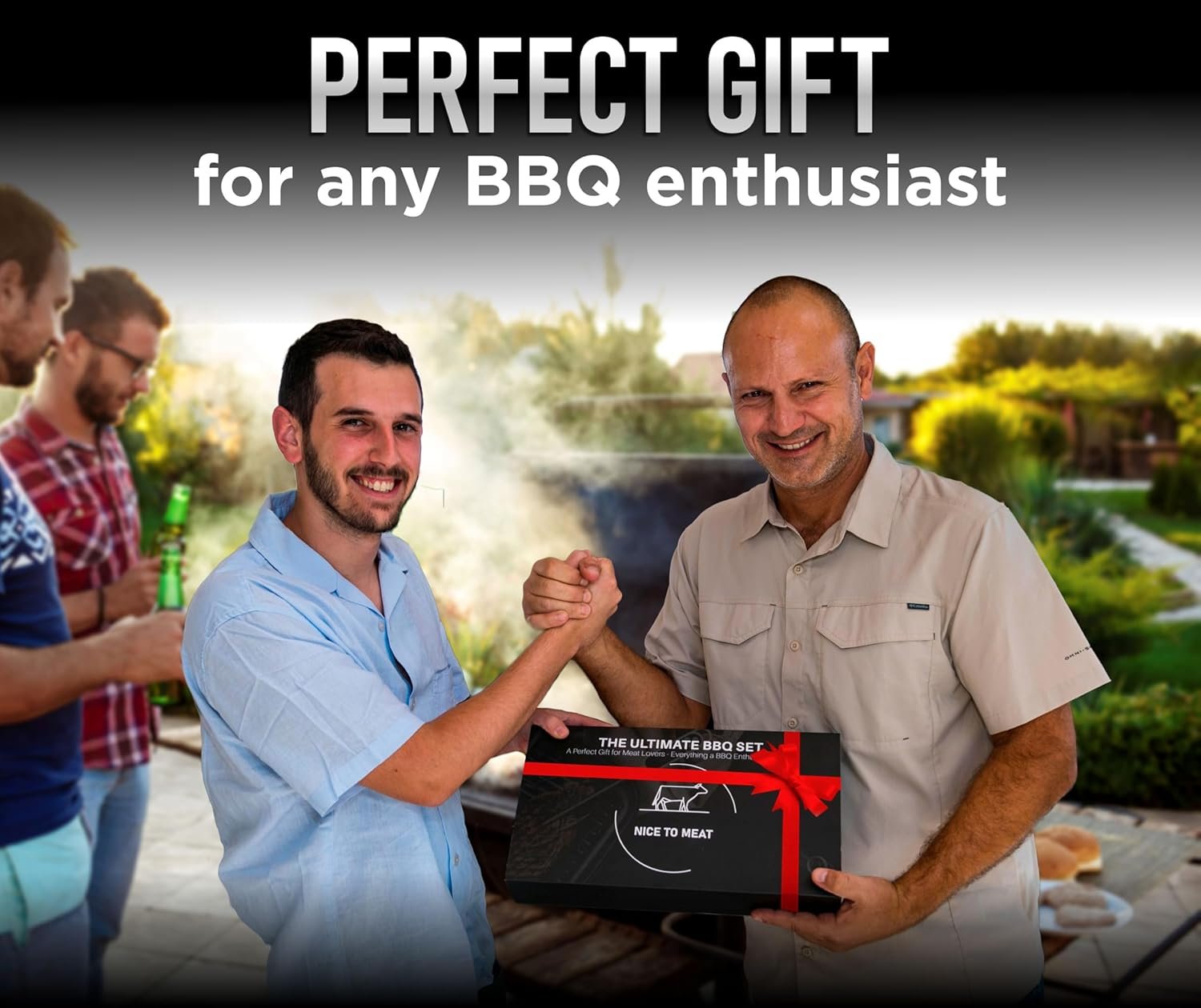 Your Complete BBQ Set – This set includes everything you need for grilling, a meat thermometer digital wireless, a quality knife, a knife sharpener, and a two-pronged fork, so you’re fully equipped to cook.