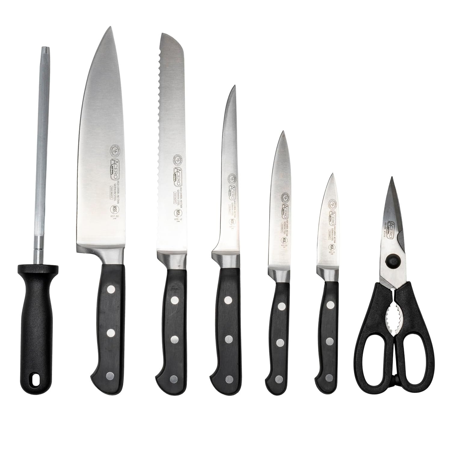 The Winco KFP-BLKA Acero professional knife block set offers unmatched durability. This commercial-grade knife set is designed to withstand daily use in commercial foodservice by professional chefs ideal for restaurants, hotels and catering. The full tang handle ensures exceptional balance and durability. Each knife is forged from high-strength X50 Cr MoV15 German steel for precision cutting, dicing, chopping and slicing. The wooden knife block ensures your knives are stored and accessible. This professional knife set includes (1) 3.5″ Paring Knife, (1) 5″ Utility Knife, (1) 6″ Boning Knife, (1) 8″ Chef Knife, (1) 8″ Bread Knife, (1) 8″ Sharpening Steel, (1) Wooden Knife Block and (1) Set of Kitchen Shears.