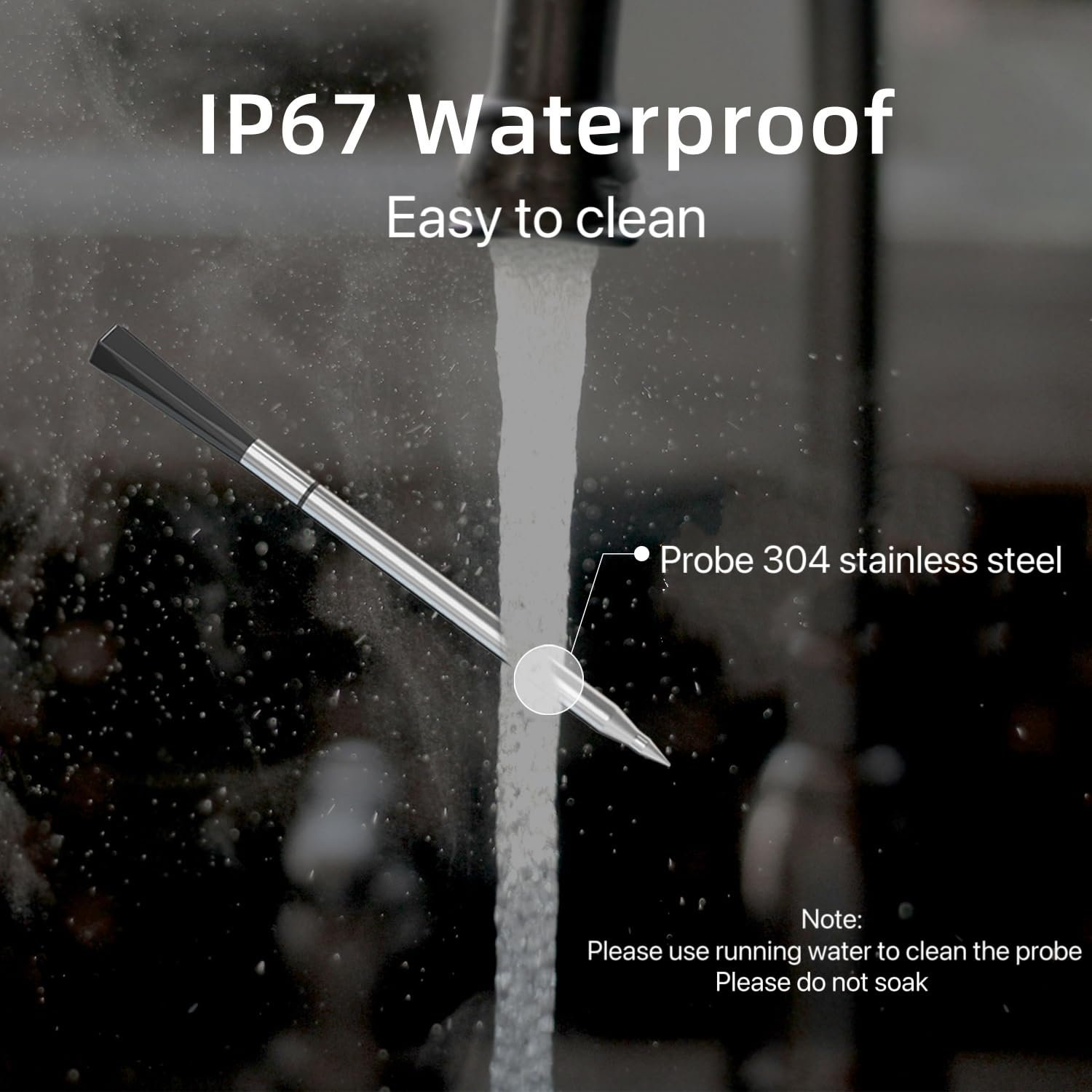 【Durable & Easy to Clean】 The probe of the wireless meat thermometer is made of food-grade stainless steel and has an IP67 waterproof rating. The housing is made of flame-retardant, high-temperature-resistant, and drop-resistant ABS mirror material. After use, it can be easily wiped under tap water. For deep cleaning, it is also dishwasher-safe, allowing you to remove food residues effortlessly.