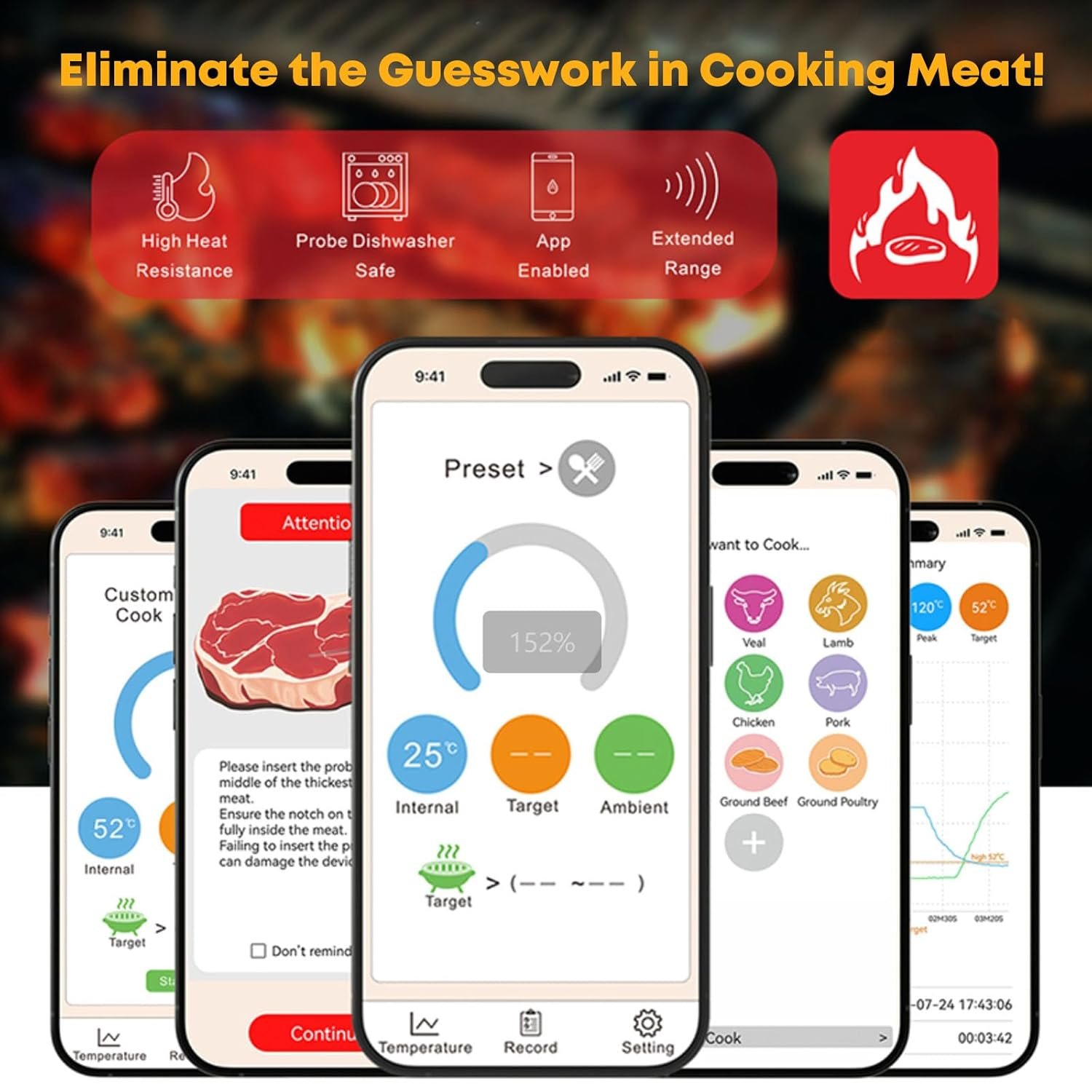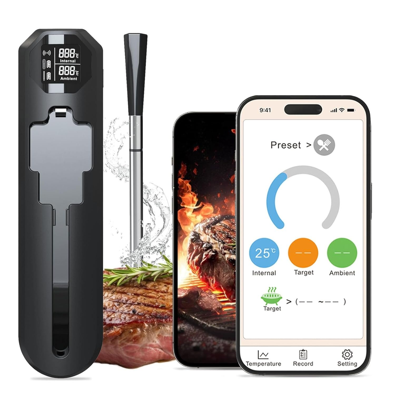 Real-Time Temperature Updates: Track your cooking with ease using the bluetooth meat thermometer. The dedicated app syncs in real-time, providing constant updates on both internal and ambient temperatures, ensuring perfect results for your steaks, ribs, and other dishes.