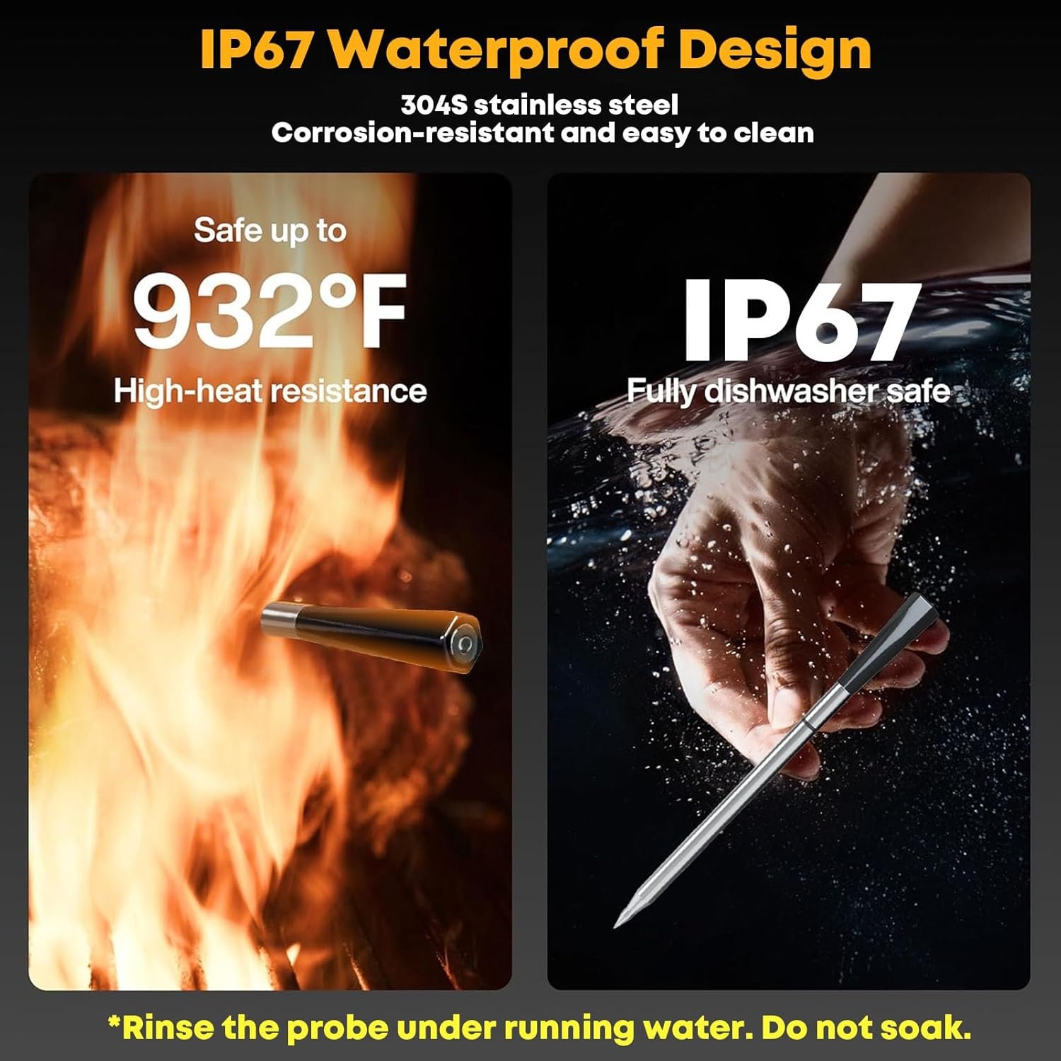 Waterproof and Easy to Clean: With its IP67 waterproof rating, this digital meat thermometer is splash-resistant and submersible, perfect for messy cooking environments. The food-grade stainless steel probes are dishwasher-safe for easy and convenient cleaning.