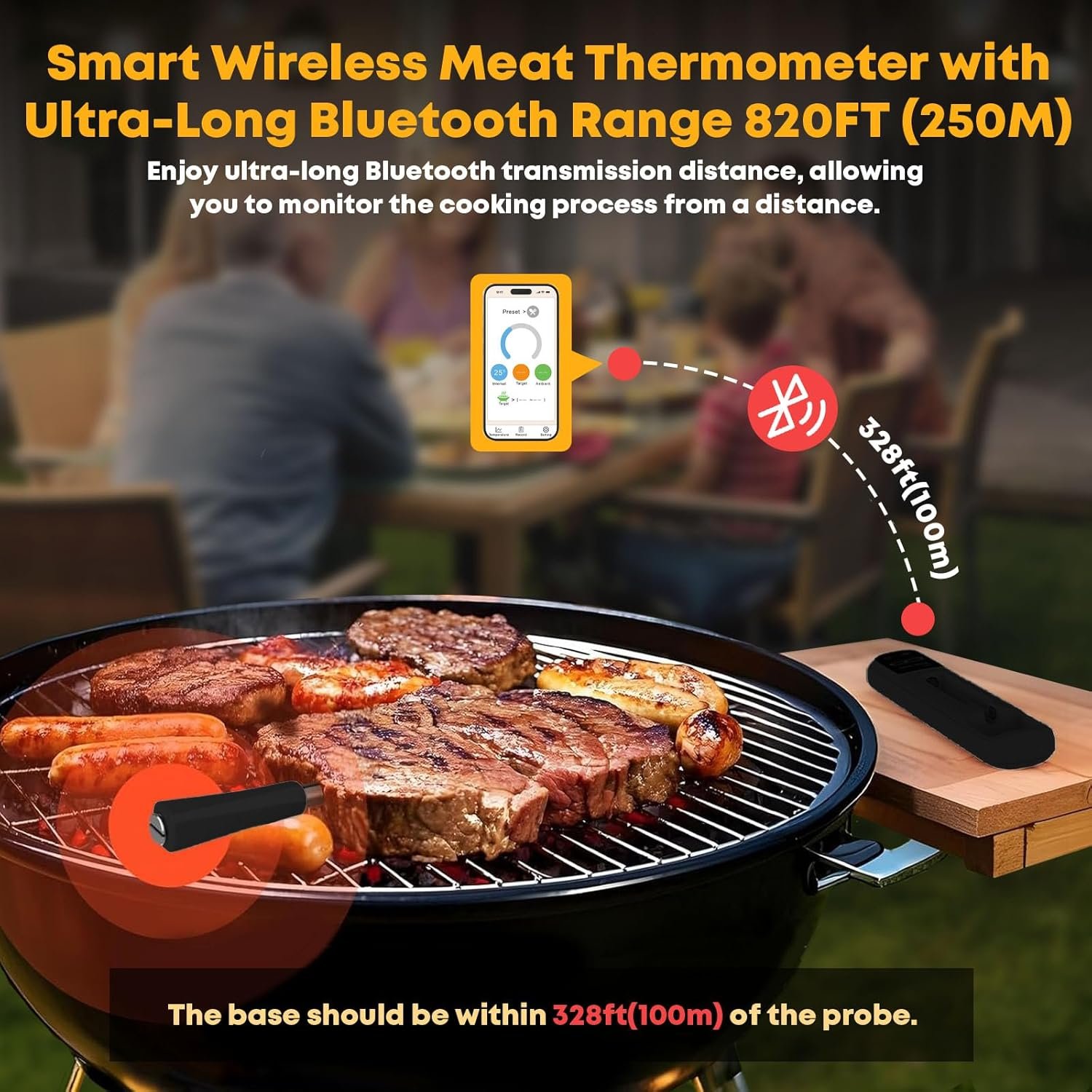 Ultra-Long Bluetooth Range: The meat thermometer digital wireless features advanced Bluetooth 5.3 technology, providing a remarkable 820FT (250M) range. Enjoy the freedom to move around while remotely monitoring your food’s temperature during grilling, smoking, or roasting.