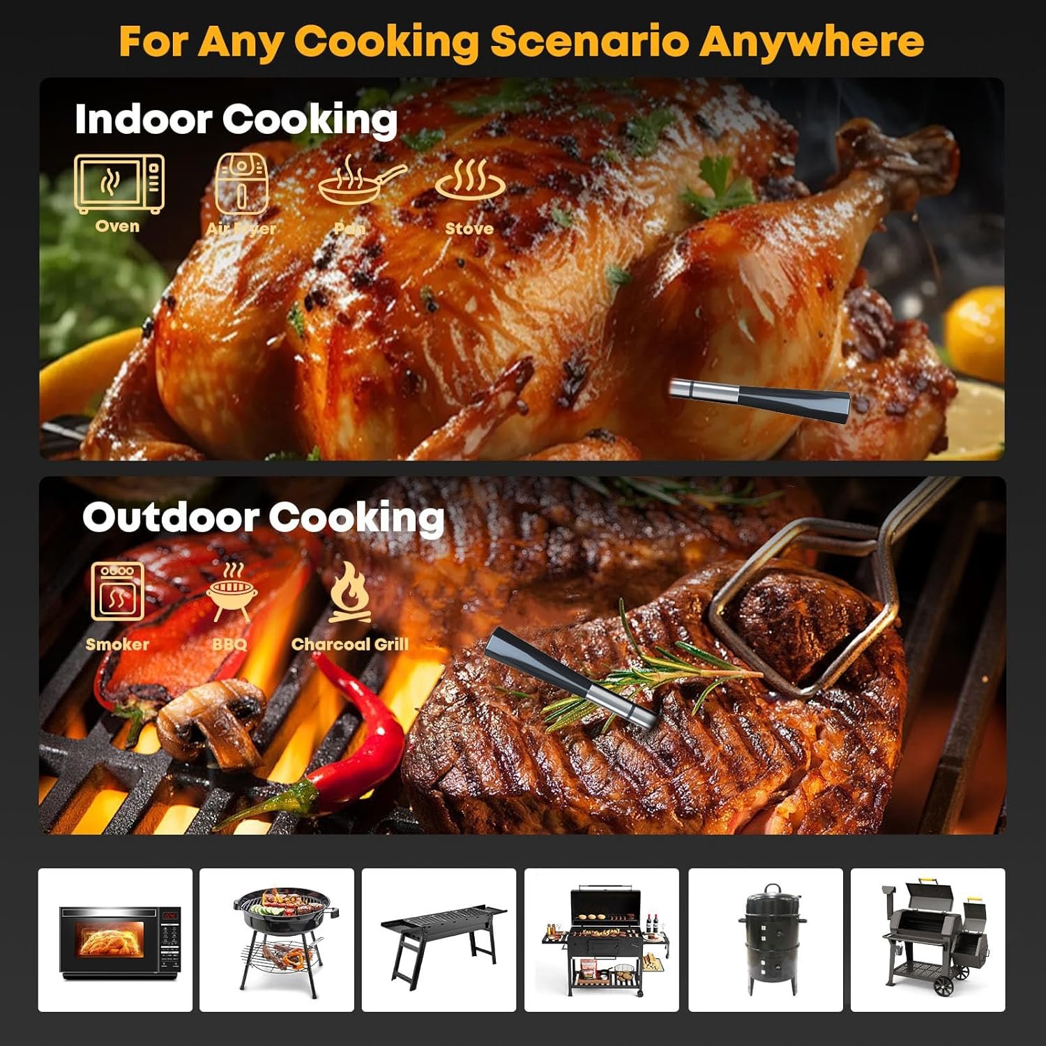 Dual Temperature Sensors for Precision: Equipped with dual sensors for both wireless meat thermometer for grilling and smoking as well as the ambient temperature, this thermometer ensures precise readings. Monitor internal and cooking environment temperatures for optimal results.