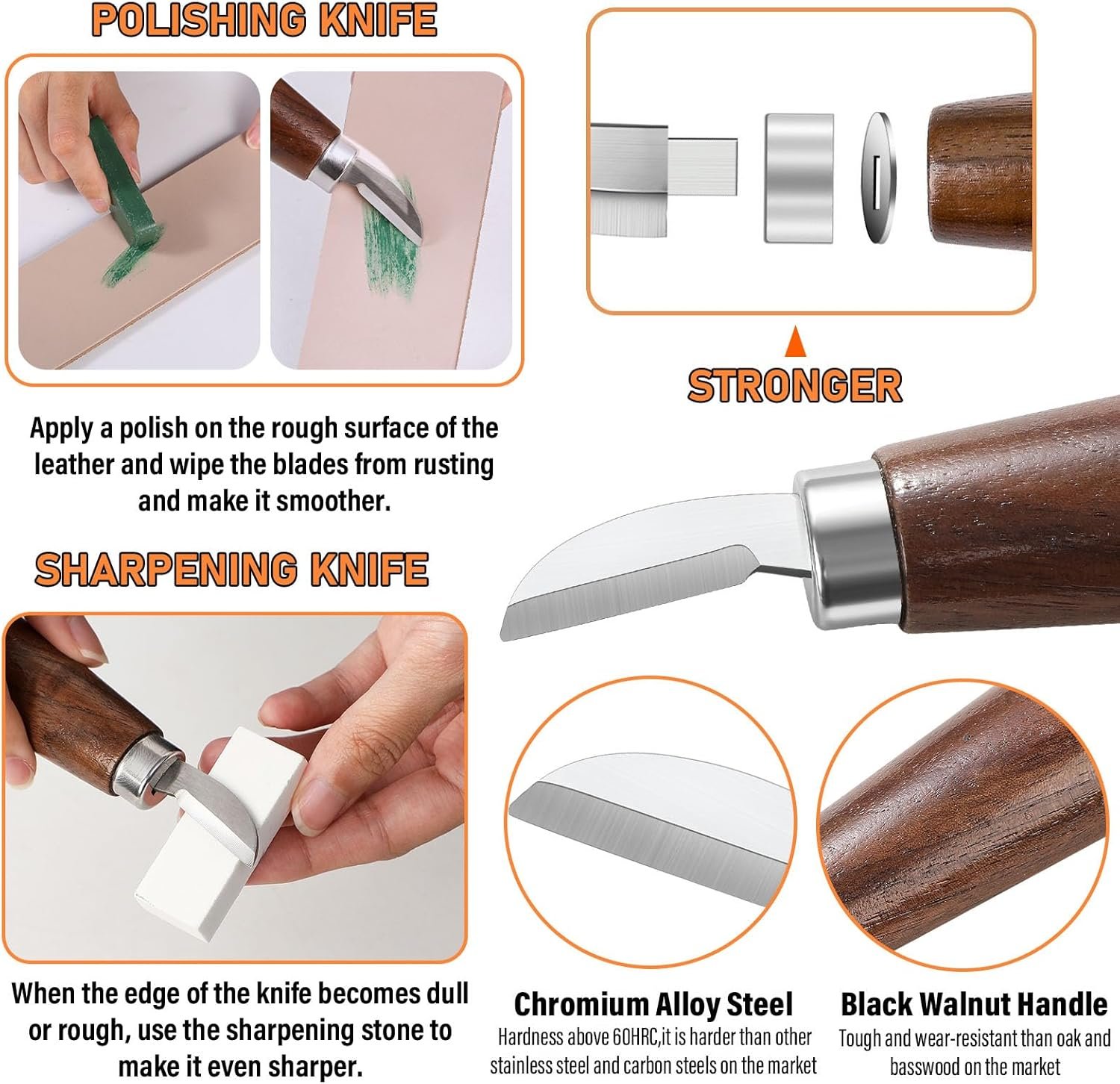 Premium Quality Wood Carving Knife—Our wood carving knives are made of chrome vanadium alloy steel,feature excellent sharpness, high hardness to keep knives edge razor-sharp and not curling after several wooden carving,and exceptional corrosion resistance. Black walnut as the woodcarvers first choice create comfortable green wood carving tools. Handle length about 4inch, no matter adult and older kids are able to hold carving wood knife tightly.