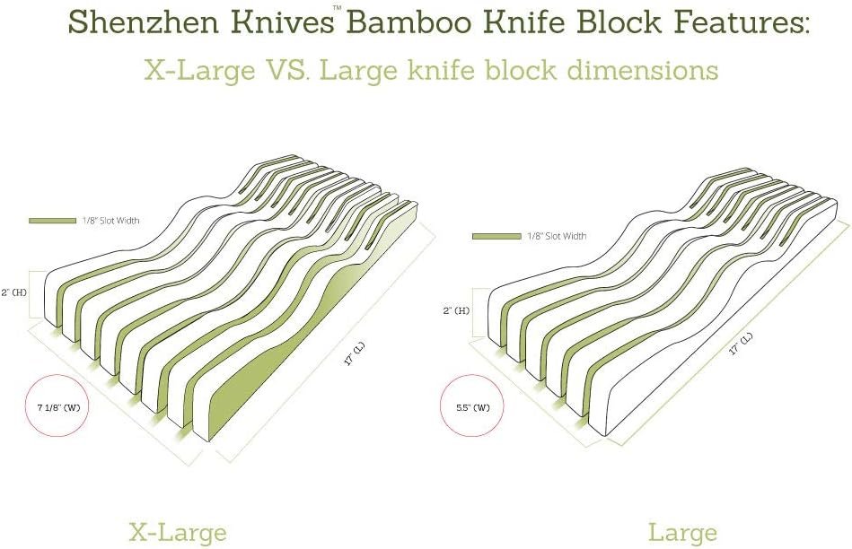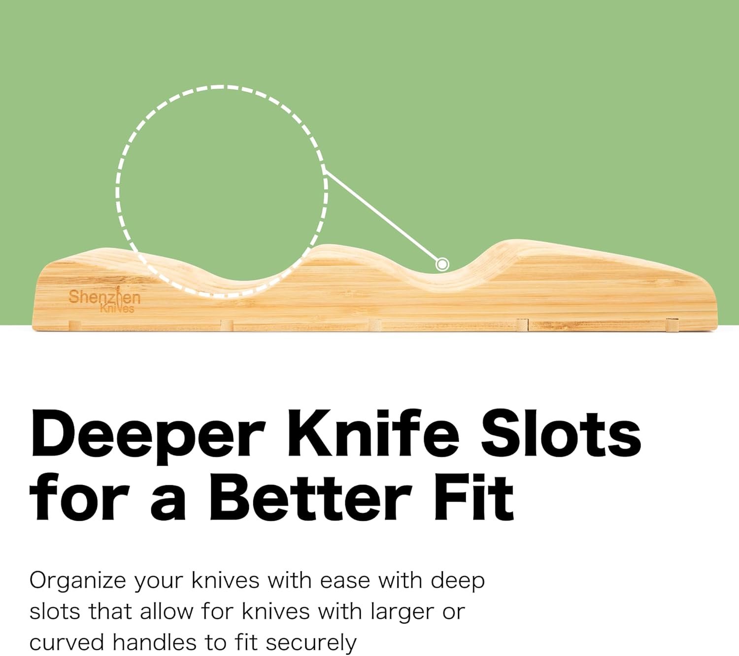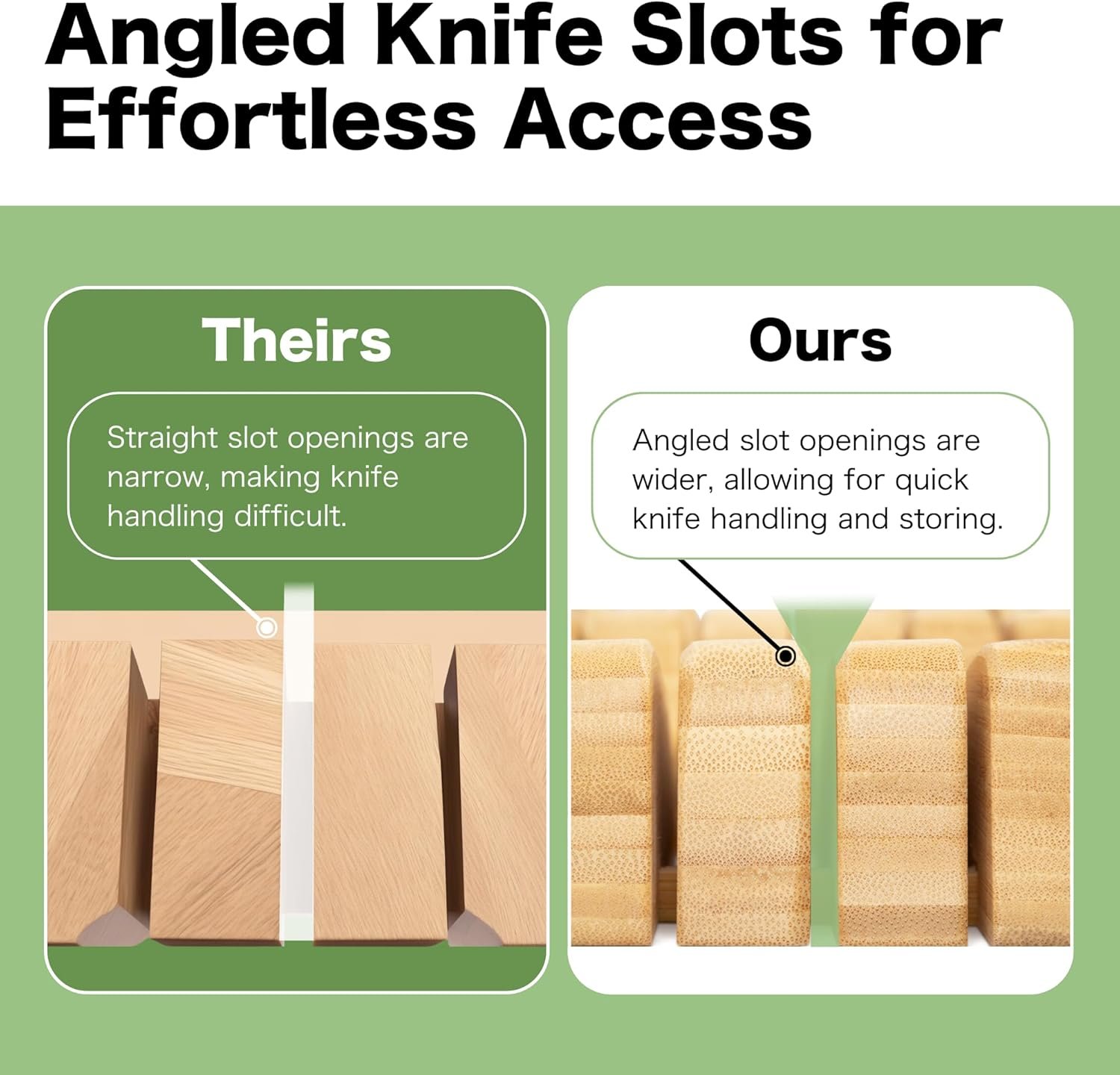 ANGLED SLOT DESIGN: The bamboo knife block design has been updated to feature angled slots with wider openings to allow for easier handling and storage of your sharpest blades