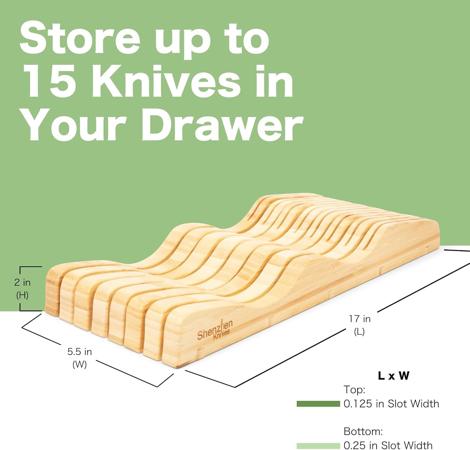 X-Large In-Drawer Bamboo Knife Block: 15 Slot (Holds 12-15 Knives) Empty Wooden Knife Holder for Kitchen Drawers – Cutlery Tray Organizer & Storage