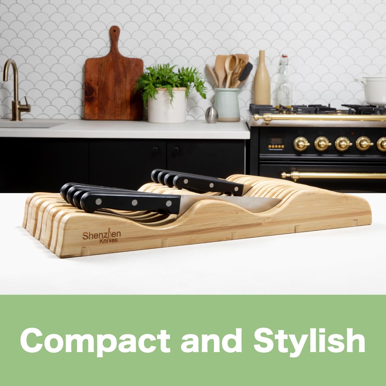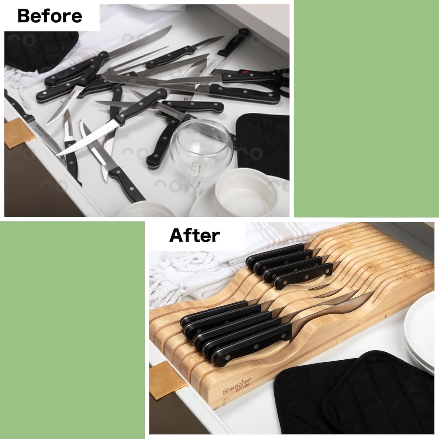 DECLUTTER THE COUNTER: This innovative drawer insert measures H 17” x W 7.125” x H 2” to fit most standard drawers, letting you free up valuable counter space while discreetly storing your knife sets