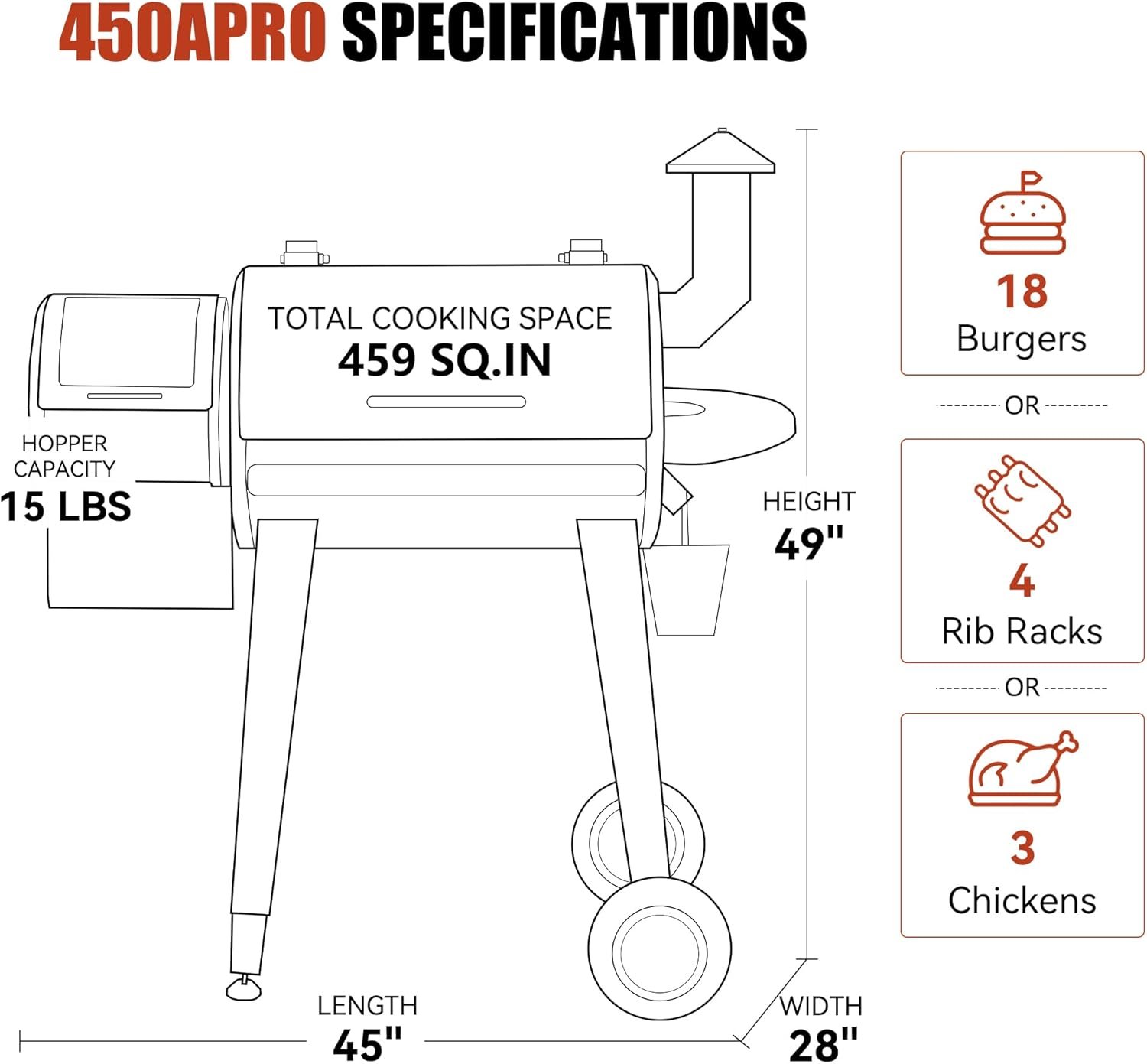 NEWLY UPGRADE–Upgraded with PID controller and added meat probe port, maintaining precise temperatures throughout the entire cooking process. And the landscape LCD digital control board allows you to set the cooking temperature from 180°F to 450°F.