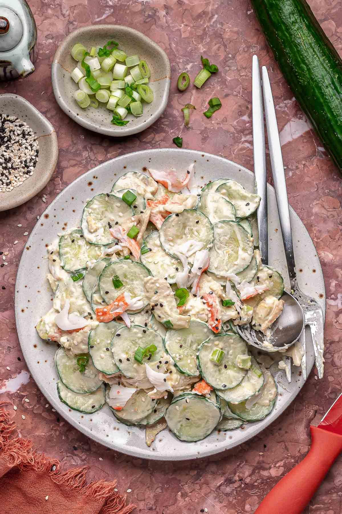In a mixing container or jar, combine cucumber, imitation crab, cream cheese, green onion, mayo, soy sauce, rice vinegar, sesame seeds, and sesame oil.