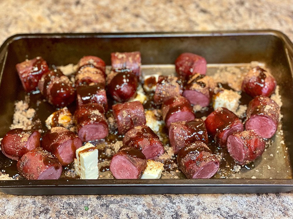 I made hotdog burnt ends and smoked meatballs. To prepare the hotdogs, I lightly coated them with yellow mustard and then seasoned them with my homemade barbecue rub. I smoked the hotdogs at 225 degrees for about an hour. The hot dogs were then sliced into one-inch pieces and topped with brown sugar, honey, butter, and barbecue sauce. I turned the temperature up to 350 and smoked the hotdogs for an additional 30 minutes.